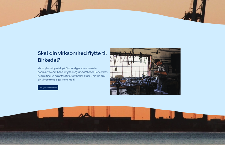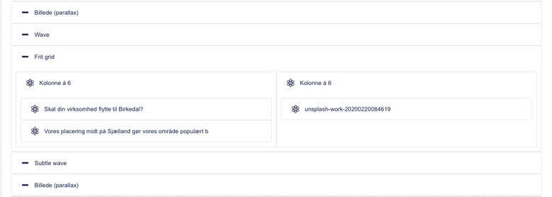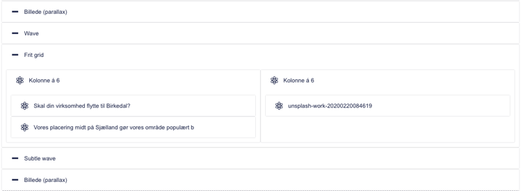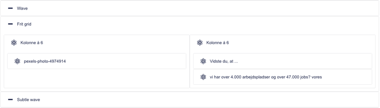 Her ses tre komponenter: en skillert i form af en bølge, et frit grid med et billede, tekst-indhold og en CTA-knap og herefter en skillert igen.