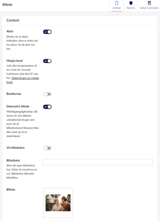 i den første kolonne tilføjes komponenten 'Billede' og billedet kan herefter indsættes