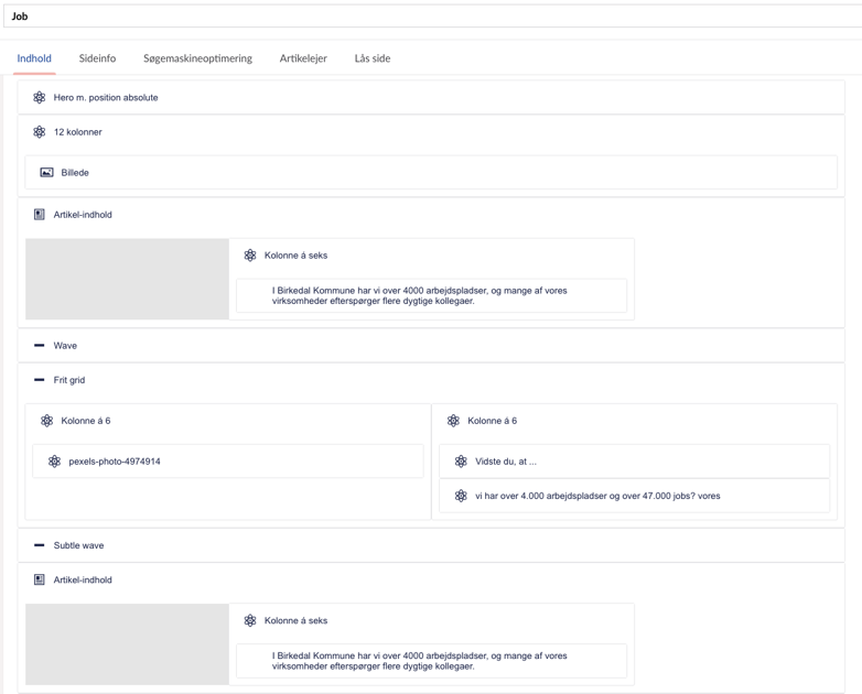 Her kan du se hvilke komponenter og indstillinger, der er brugt på sitets kreative artikelside 'Job'.