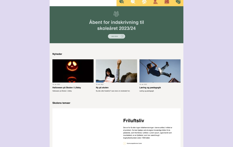 Få inspiration til at opbygge en flot og brugervenlig hjemmeside til din skole, dagsinstitution eller bosted. Find opsætningsmanualer under hvert dummy-subsite. Følg linket herunder.