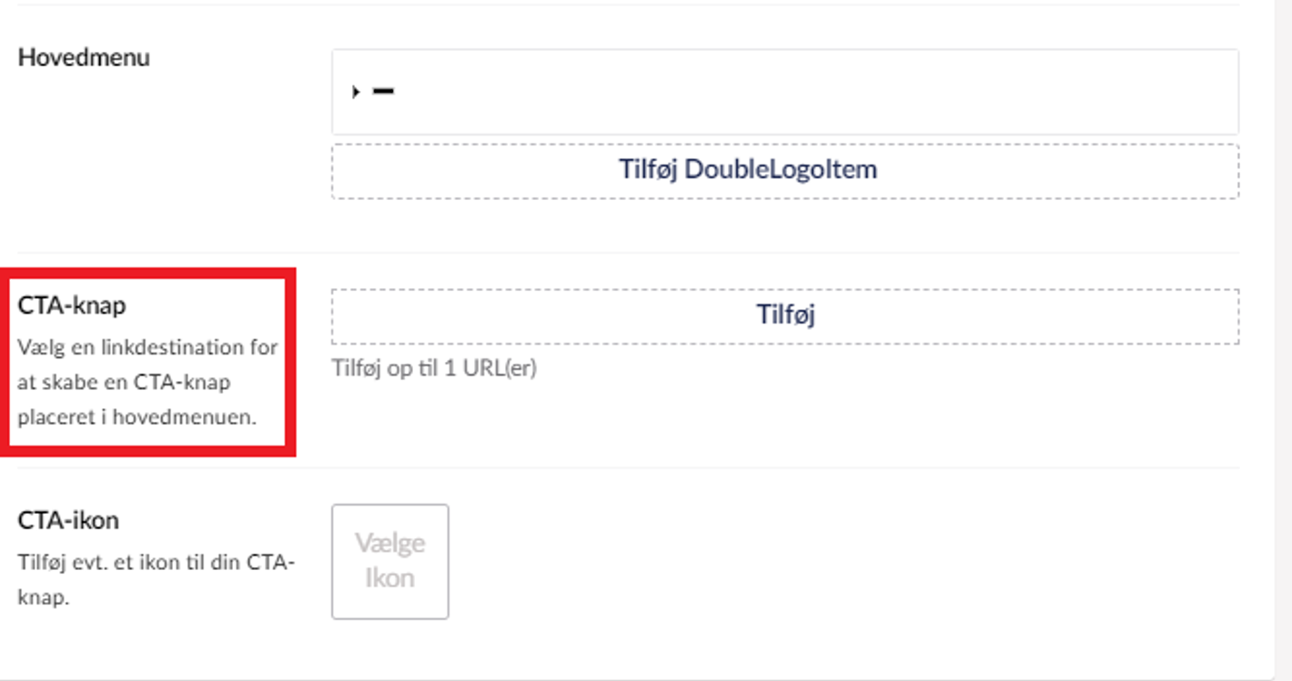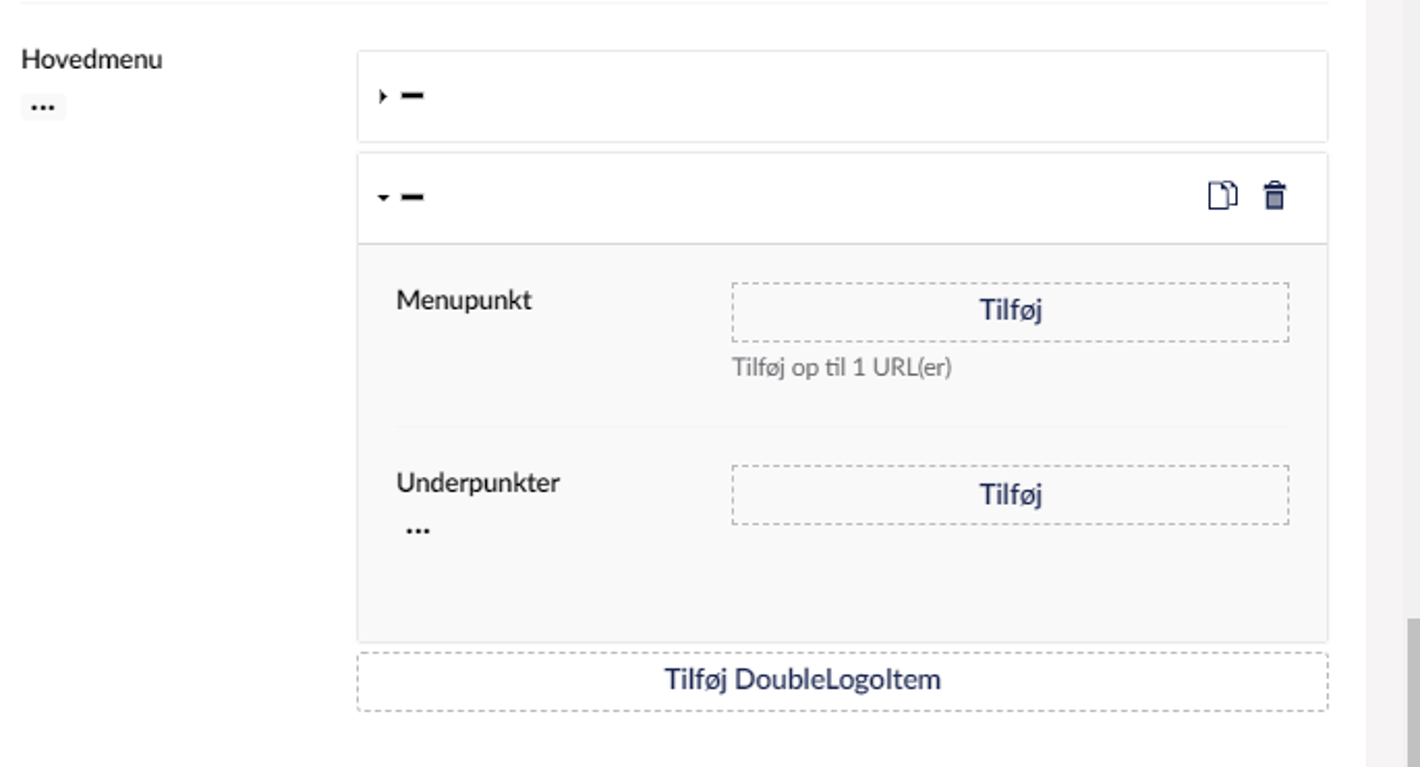 Under opsætningen af Topmenuen finder du opsætningen af Hovedmenuen, som på din hjemmeside vil vises som dobbeltlogo-menuens nederste menu-bjælke. Både logo, logolink, Dark-mode-logo og logotekst opsættes ligesom ved Topmenuen (se accordion ovenfor).