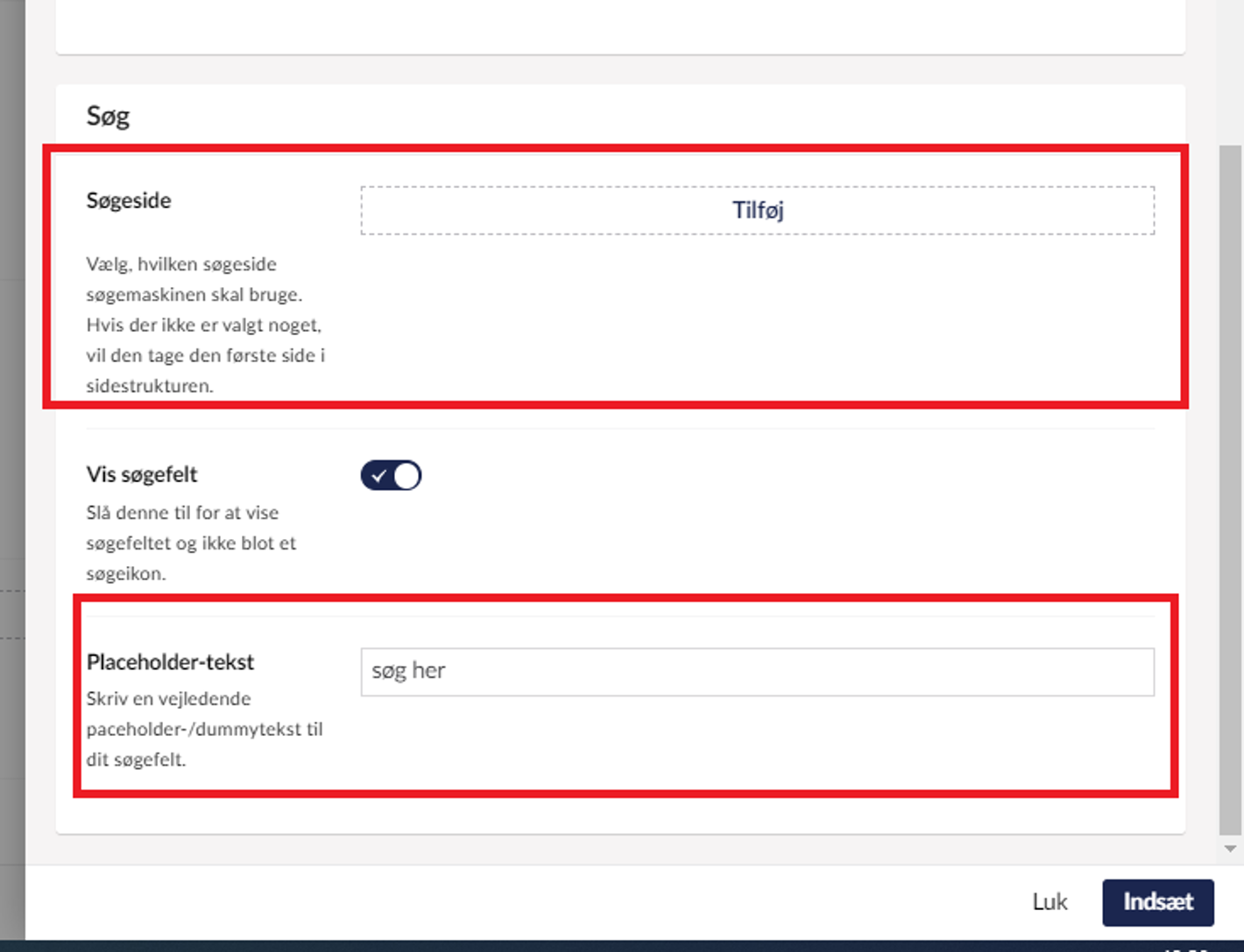 Bemærk, at der skal vælges en søgeside, hvis der skal vises et søgefelt.