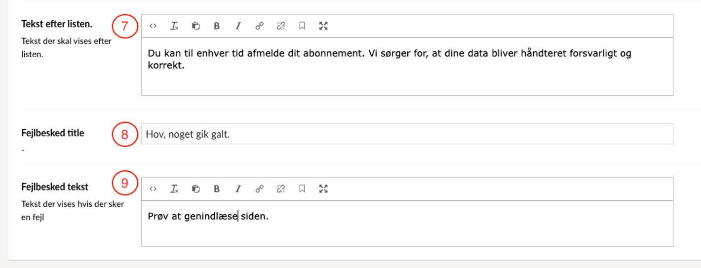 - "Tekst efter listen": Giv eventuelt mere information om abonnentet. Typisk information om abonnentens datarettigheder.