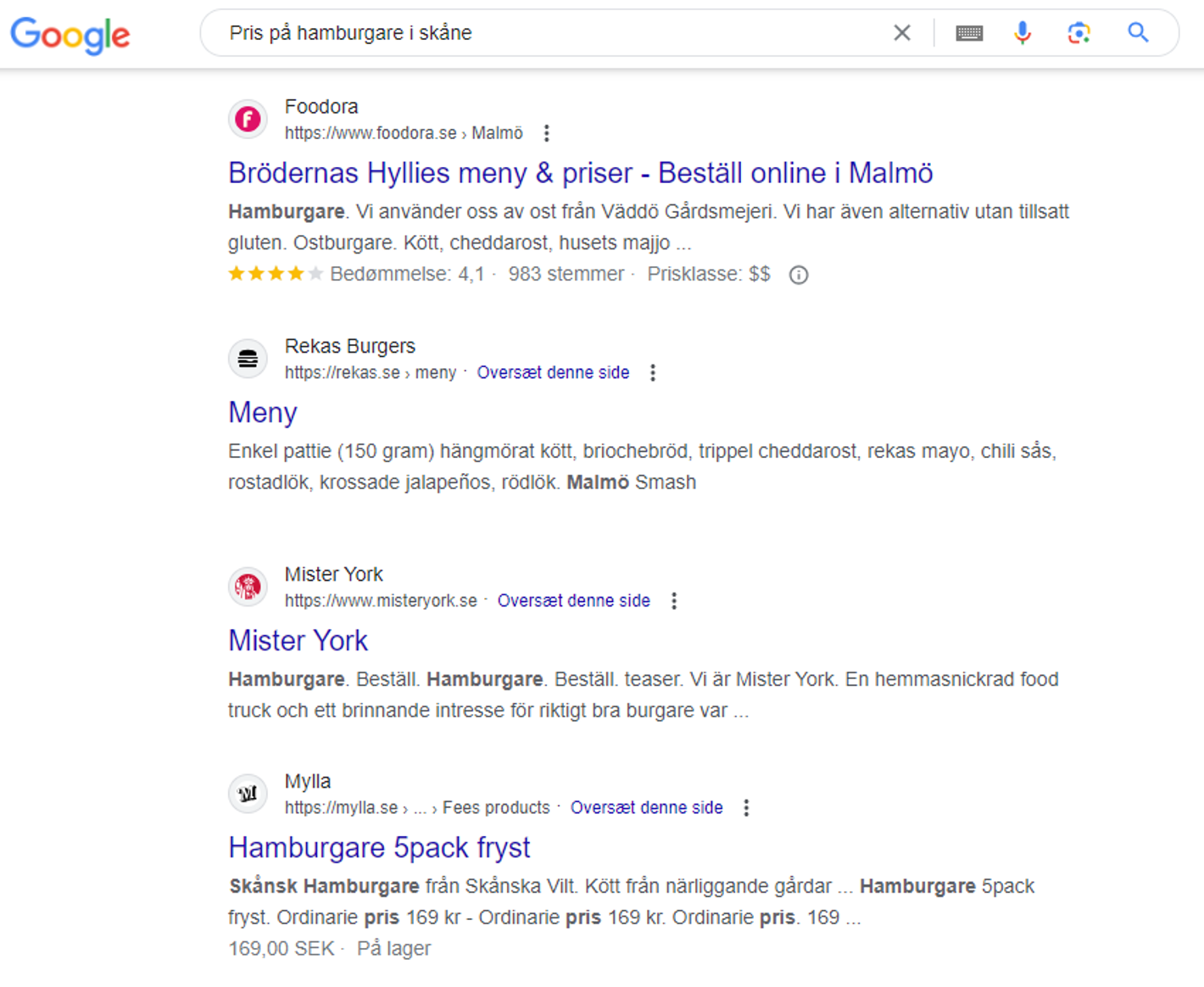 Om du söker efter " Pris på hamburgare i Skåne", kommer sökmotorn att leta efter träffar på följande tre ord: "hamburgare", "pris" och "Skåne".