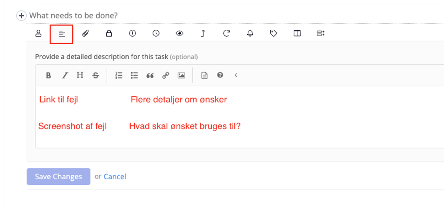 I Teamwork kan I enten oprette en opgave under "Ønsker og idéer" eller "Fejl og rettelser". Dette er med til at hælp os med at prioritere mellem opgaver - fejl har naturligvis førsteprioritet, og ønsker næsteprioritet.